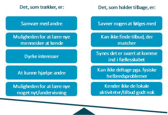 Det er naturligt at opleve uro i forbindelse med en forandring. Det kan være svært at tippe vægten, og når man skal ændre en vane, er der for mange, både noget som trækker for at skabe forandring, men også ofte en række bekymringer som holder én tilbage. I figuren nedenfor kan man se nogle eksempler på både, hvad der normalt kan hjælpe én ud af ensomheden, og hvad der også kan holde én tilbage i forhold til at komme ud af det.